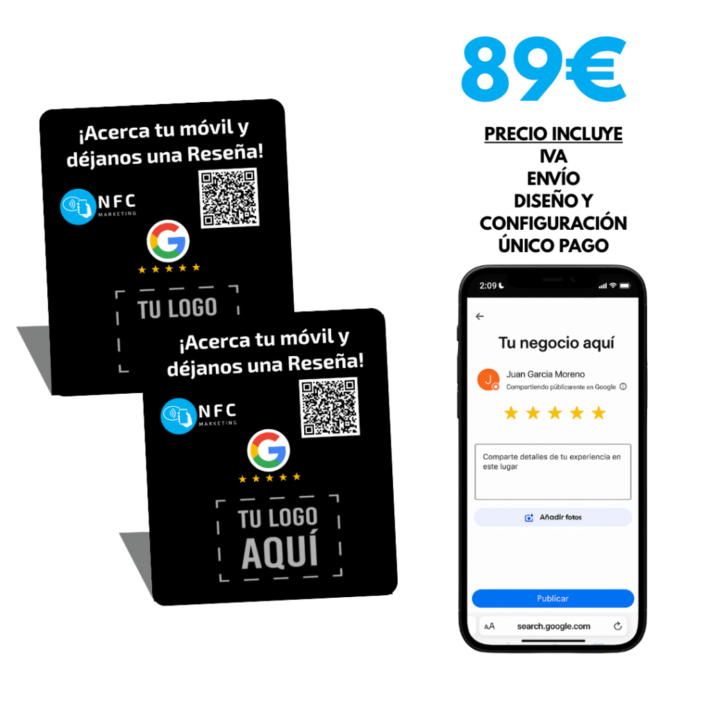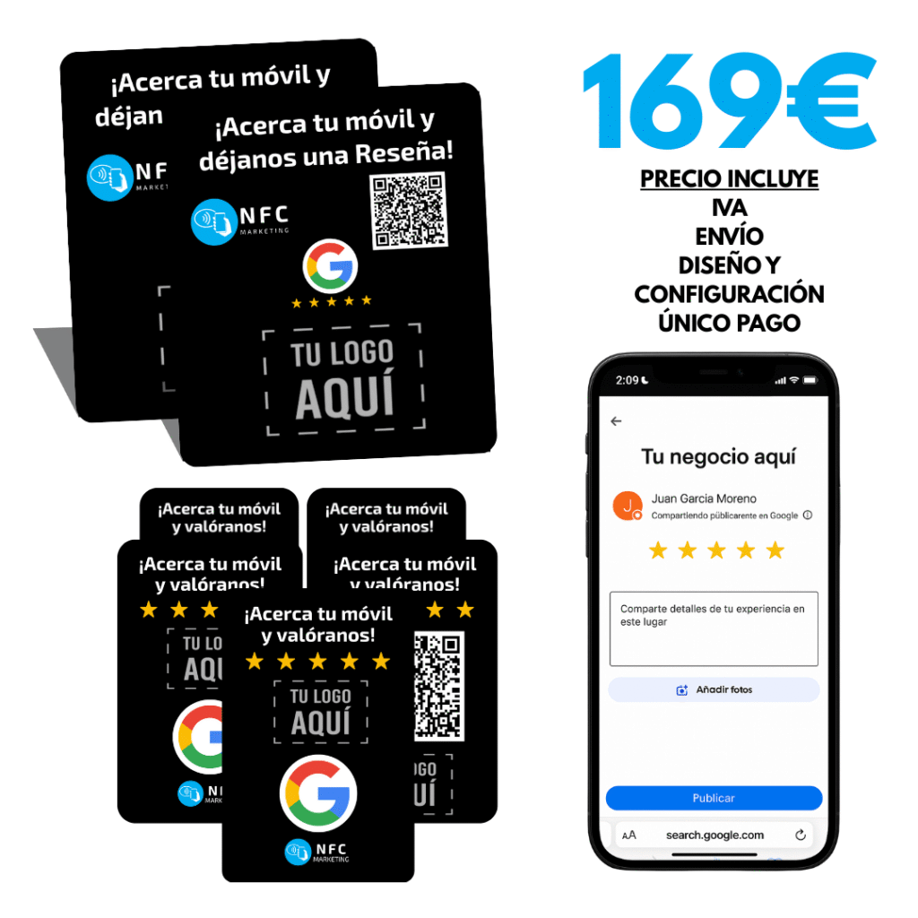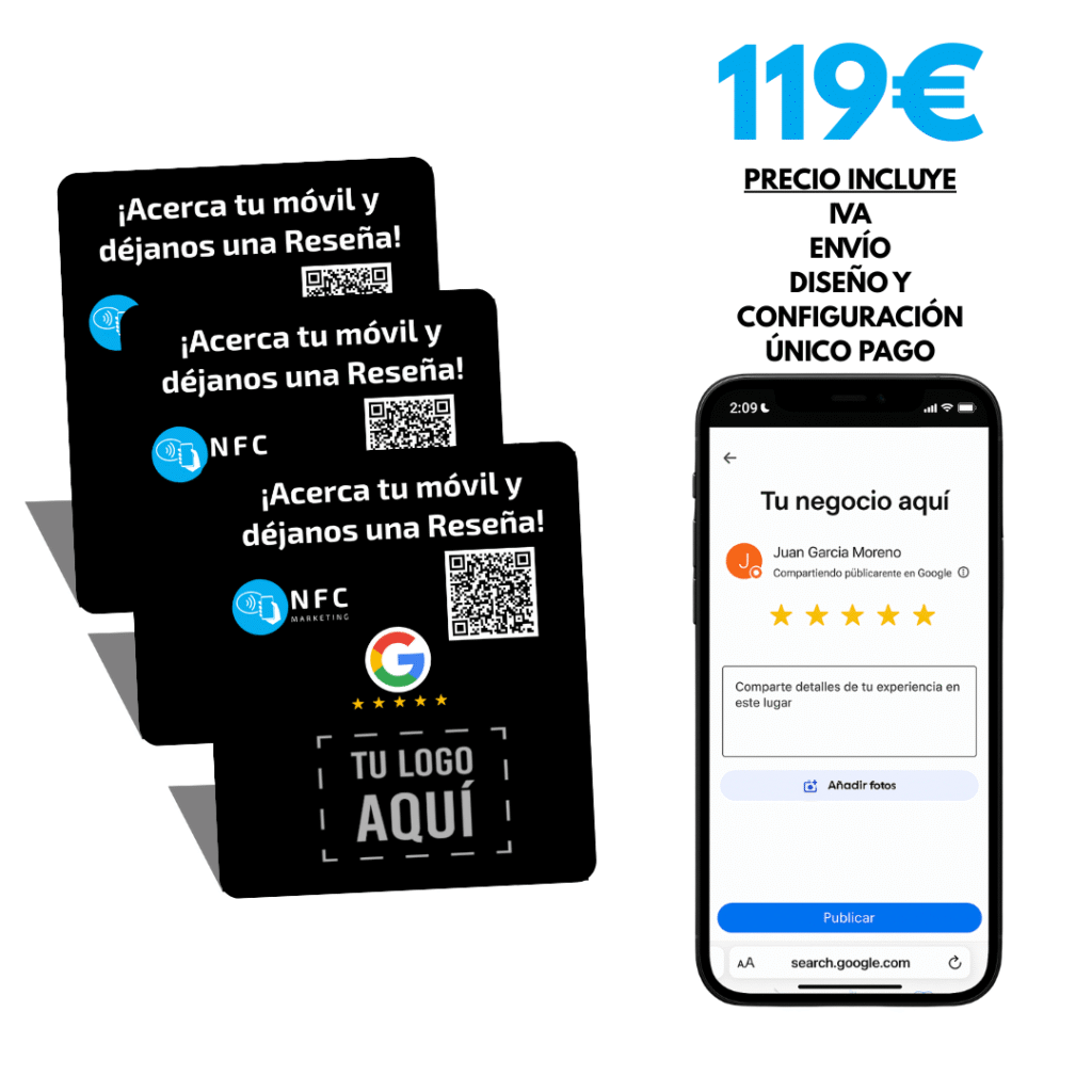 Las Tarjetas Reseñas Google son tarjetas físicas con tecnología NFC que permiten a tus clientes acceder directamente a la página de reseñas de tu negocio en Google con solo acercar su móvil, facilitando que dejen una valoración en segundos.
